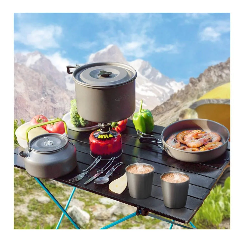 Incluye olla con tapa, sartén, hervidor, dos tazas de acero inoxidable y cubiertos, todo compacto y ligero para facilitar su transporte. Además, su práctica bolsa permite una organización impecable, convirtiéndolo en el complemento perfecto para campamentos con estilo y confort.
