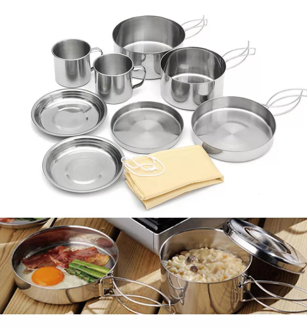 Consta de 8 piezas compactas y ligeras: dos ollas (una con tapa), un sartén, dos platos, dos vasos y una bolsa práctica para transporte y organización.
